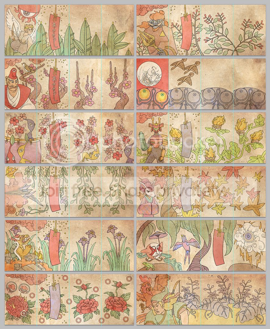 I've produced a very limited run of custom Hanafuda playing cards. I think they would make great stocking stuffers or a Secret Santa pack-in for 2015. For those who aren't familiar, "flower cards" were Nintendo's first product and are still being made to this day. This is my take on a classic, satirizing some familiar faces and themes as a throwback to Edo Japan. I illustrated these myself. They are 2.25" x 3.5" Bridge size cards, they should fit in protective sleeves intended for YuGiOh cards.