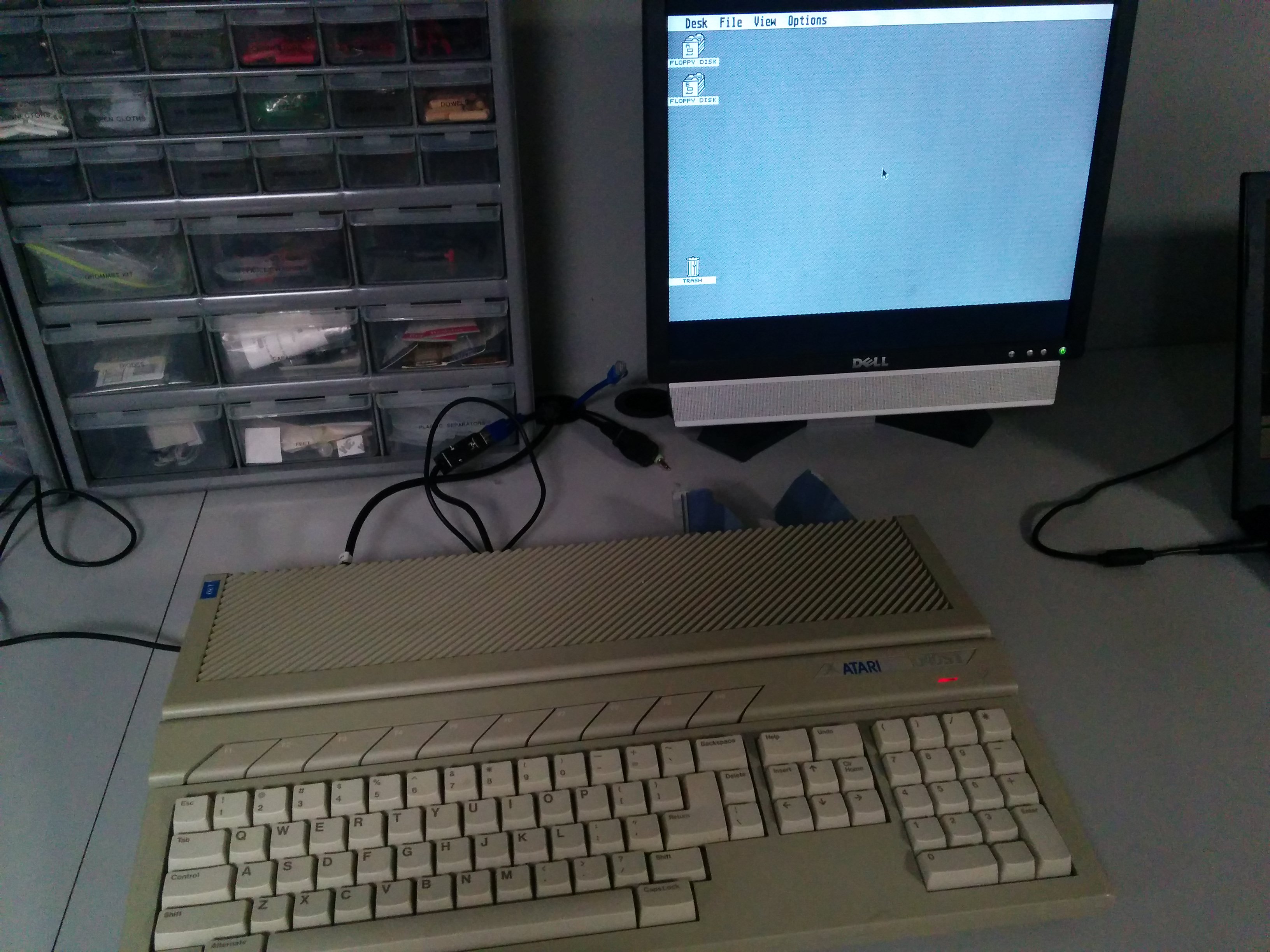 Got it hooked up and purchased a VGA adapter cable off eBay. It powers up to a gray screen and stays there for quite a while with the disk drive clicking. At first I thought it wasn't working, but eventually it does boot to a TOS (?) screen. Here are some pics: